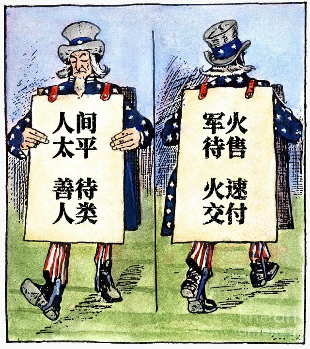 ▲ 一幅 1917 年的讽刺漫画:美国一面讲"人间太平,善待人类",另一面则大谈"军火待售,火速交付"。