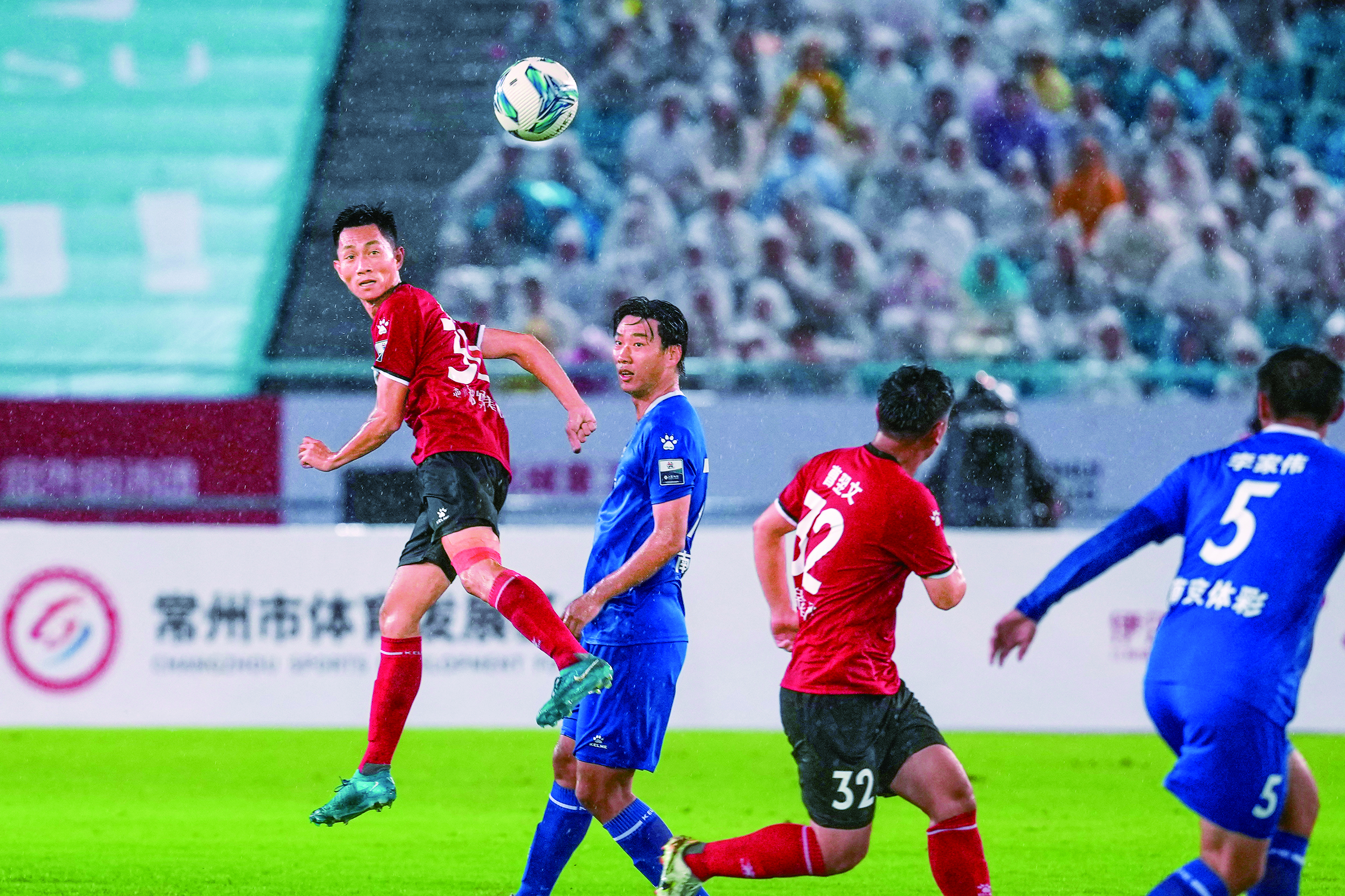 六月二十一日,常州队球员卢志勇(左一)在“苏超”第五轮对阵南京队的比赛中。最终,常州队主场不敌南京队。新华社记者李博摄
