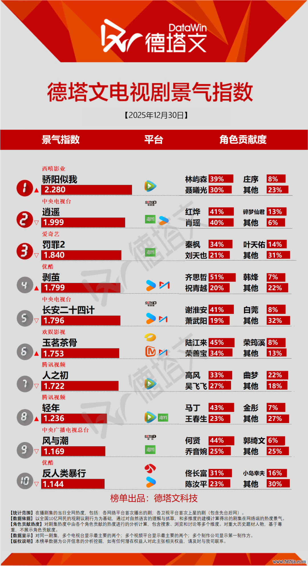 古装玄幻剧《逍遥》于12月27日登陆CCTV-8及爱奇艺、优酷双平台,开播次日即跻身市场前三,当前景气峰值达2.073。剧集凭借高国民度阵容与精良制作引发关注,在竞争激烈的年末档期中表现稳健。