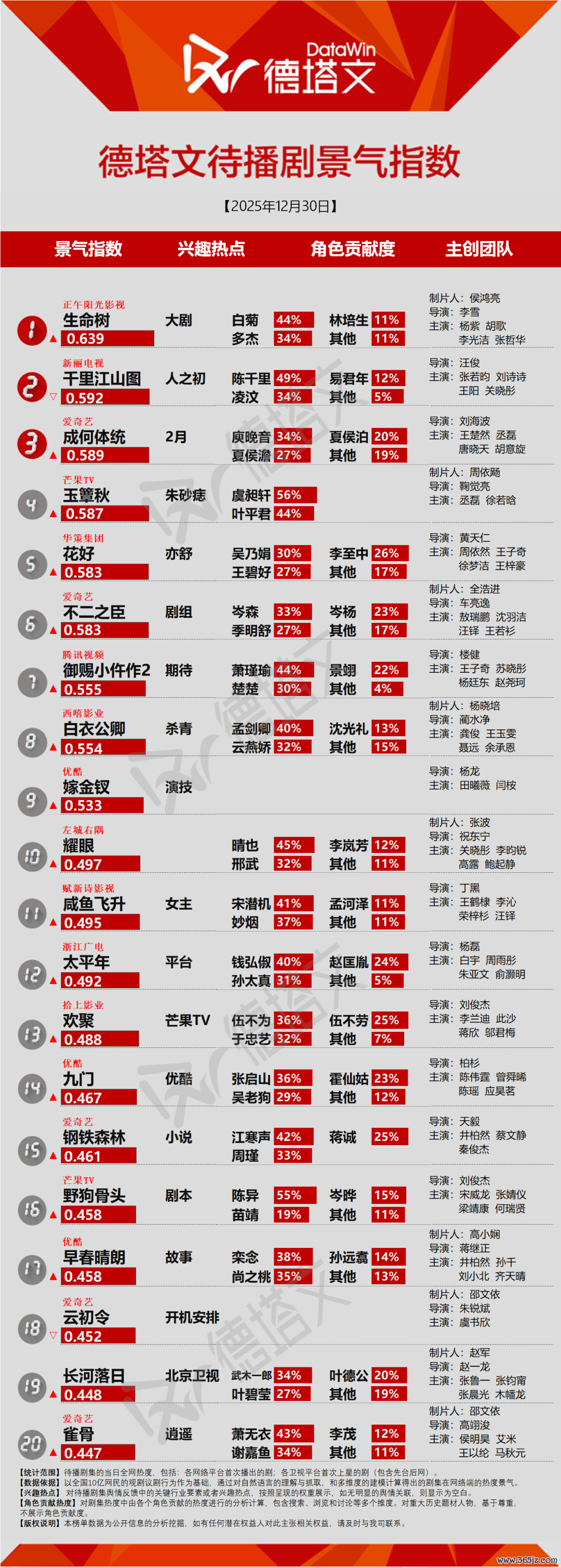 生命树(白菊44% 多杰34%) 千里江山图(陈千里49% 凌汶34%) 成何体统(庾晚音34% 夏侯澹27%) 玉簟秋 花好 不二之臣 御赐小仵作2 白衣公卿 嫁金钗 耀眼 咸鱼飞升 太平年 欢聚 九门 钢铁森林 野狗骨头 早春晴朗 云初令 长河落日 雀骨
